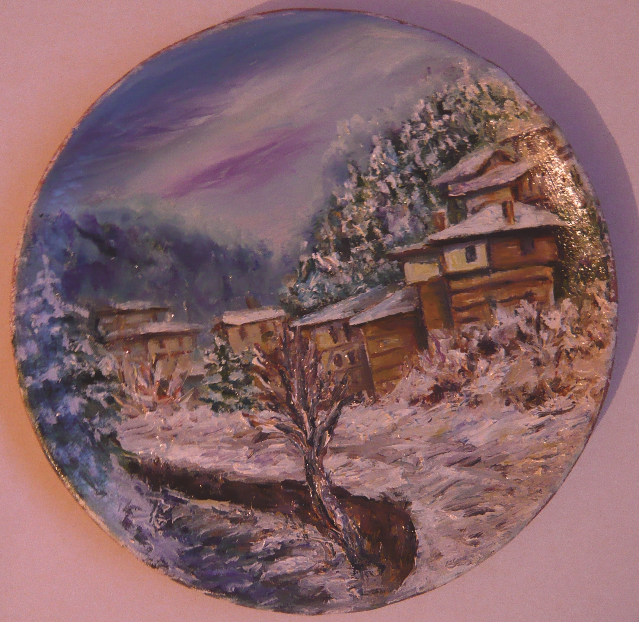 Рисувана с маслени бои керамична чиния с диаметър 18 см.Лакирана, готова за окачване на стена.