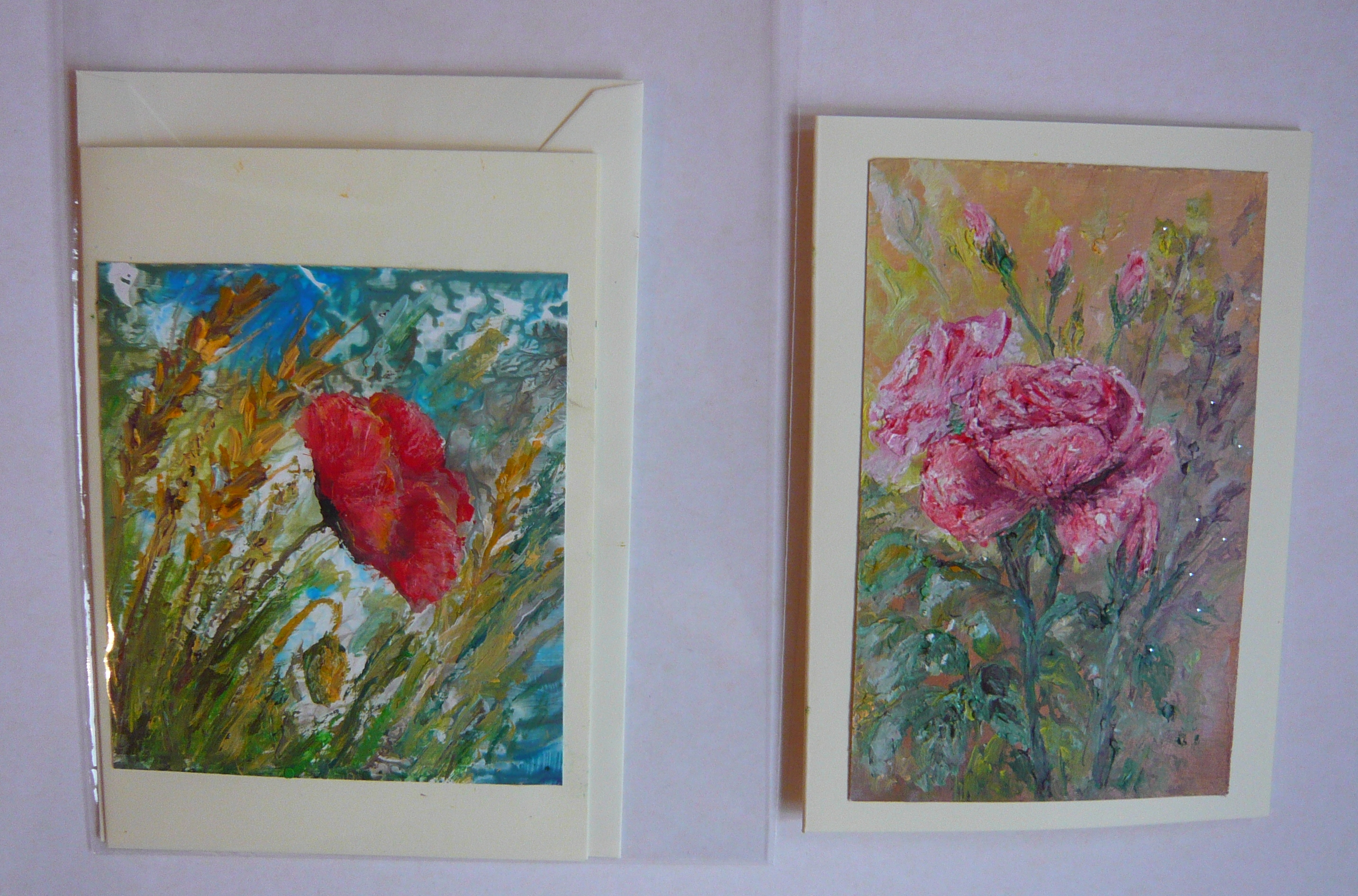 Картичките са рисувани с маслени бои върху картон с размери 15 х 10 см.В опаковките има и пощенски плик.Посочената цена е за 1 бр.