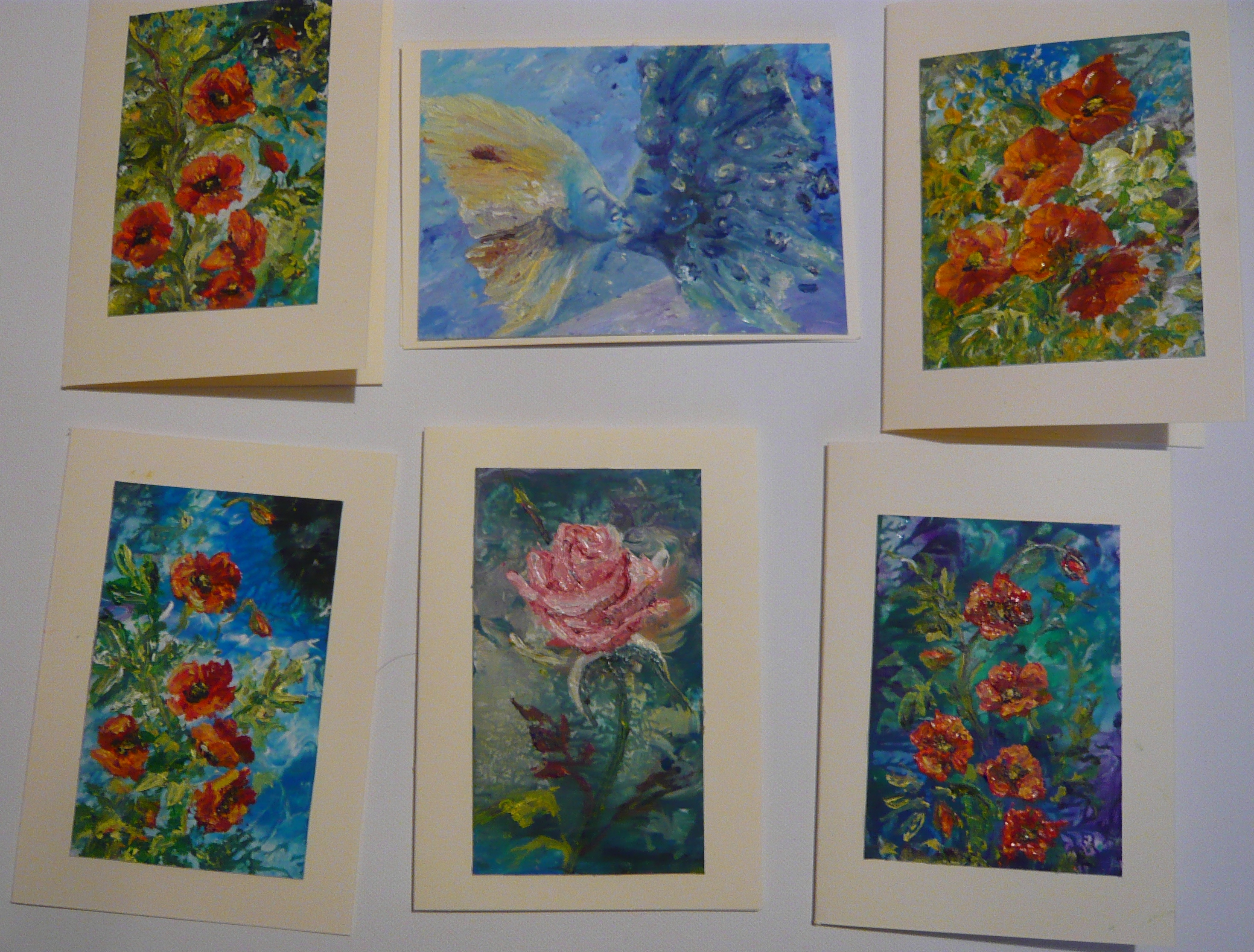 Картичките са  рисувани с маслени бои върху картон с размери 15 х 10 см.В опаковките  има и пощенски плик.Посочената цена е за 1 бр.