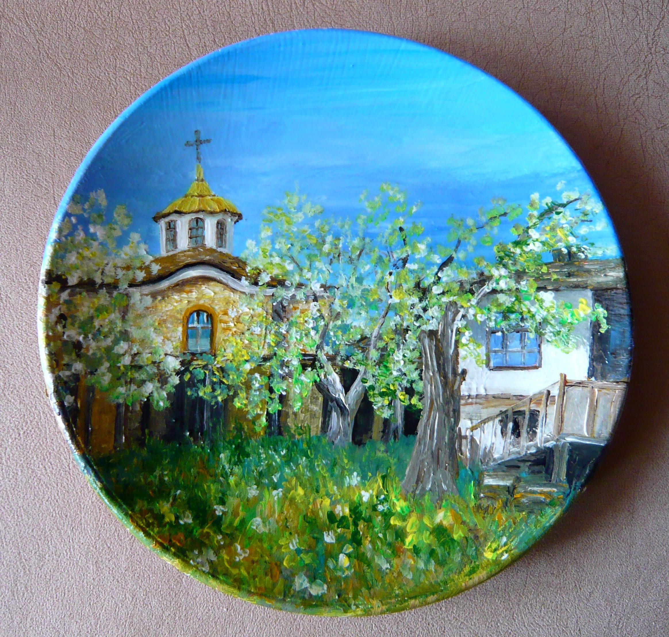 Рисувана с акрилни бои и лакирана керамична чиния с d 24 см.Може да се окачва,предлага се и дървена стойка.