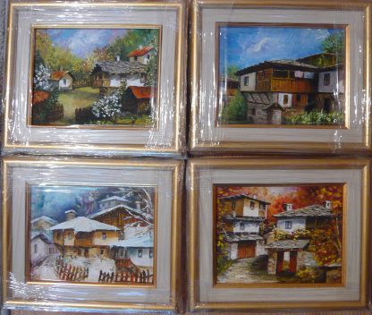 Четери миниатюри ,рисувани с акрилни бои върху платно с размери 12 х 15 см,с декоративната рамка размерите са 19 х 22см.