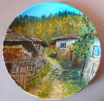 Рисувана с акрилни бои и лакирана керамична чиния,d 24 см.Може да се окачва на стена.