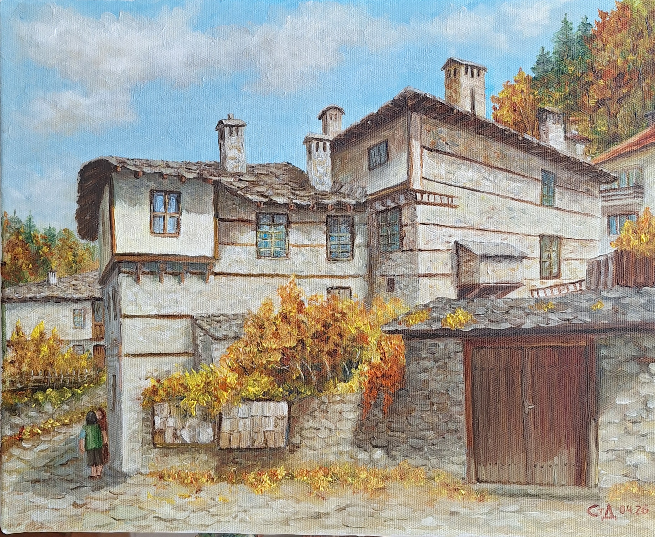 Картината е перфектно съчетание между традиционна архитектура и живата есенна природа ,пресъздадени с майсторски замах и внимание към детайла.