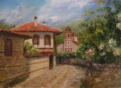 Картината е рисувана с маслени бои върху  грундирано памучно платно опънато на подрамка с размери 24 х 33 см..Размерите с декоративната рамка приблизително са  32 х 41 см.