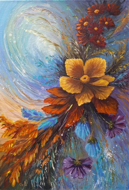 Картината е рисувана с акрилни бои върху платно с размери 50 х 35 см,  рамкирана.