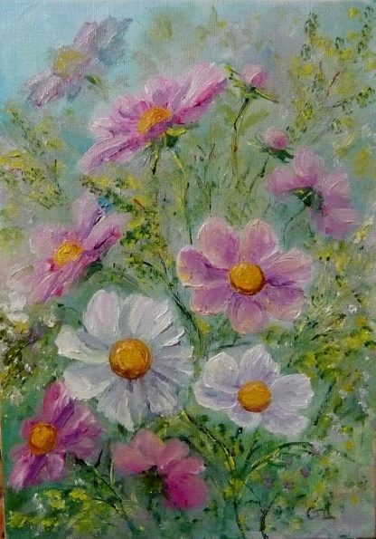 Картината е рисувана с маслени бои върху каширана повърхност , рамкирана.